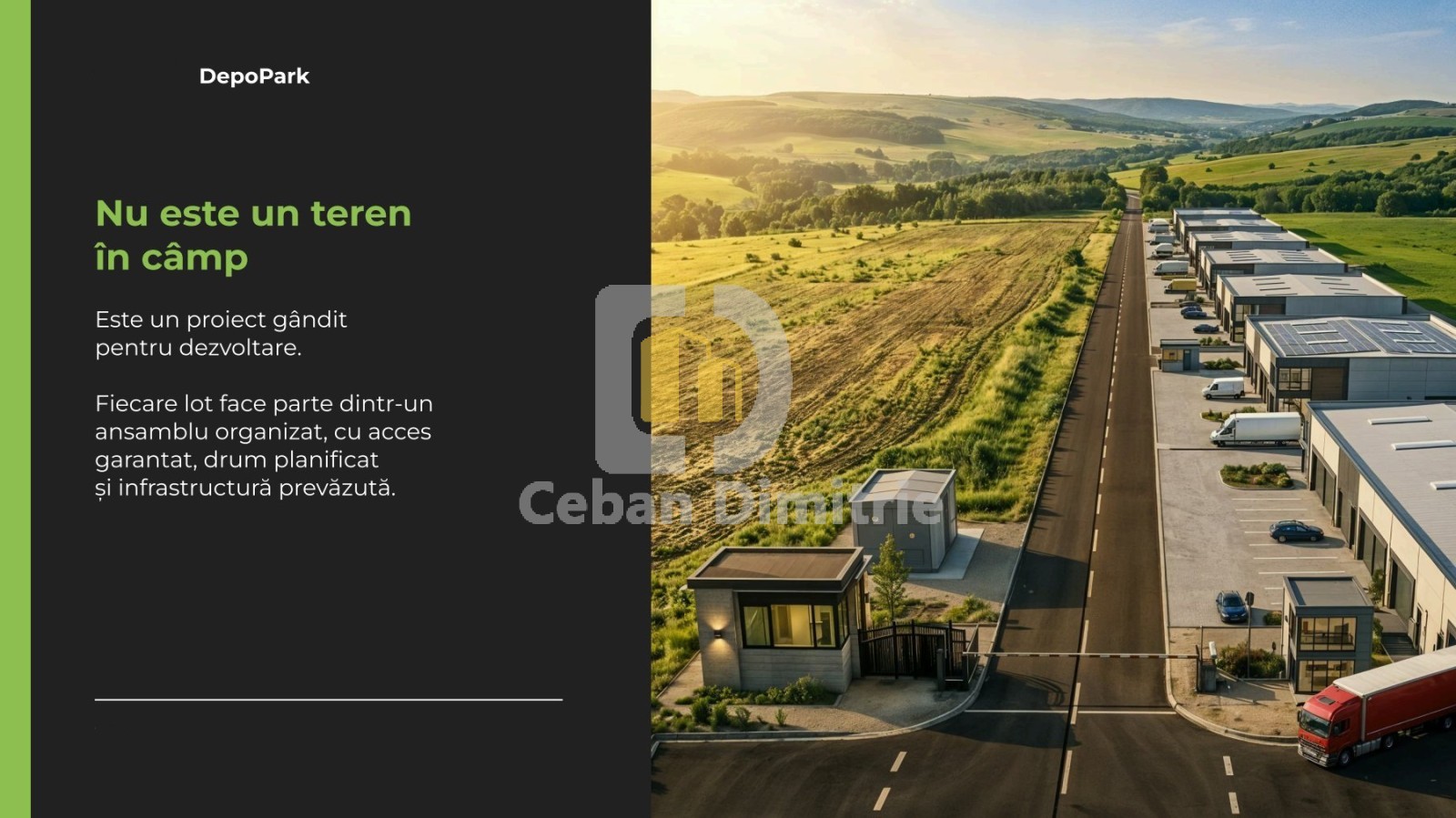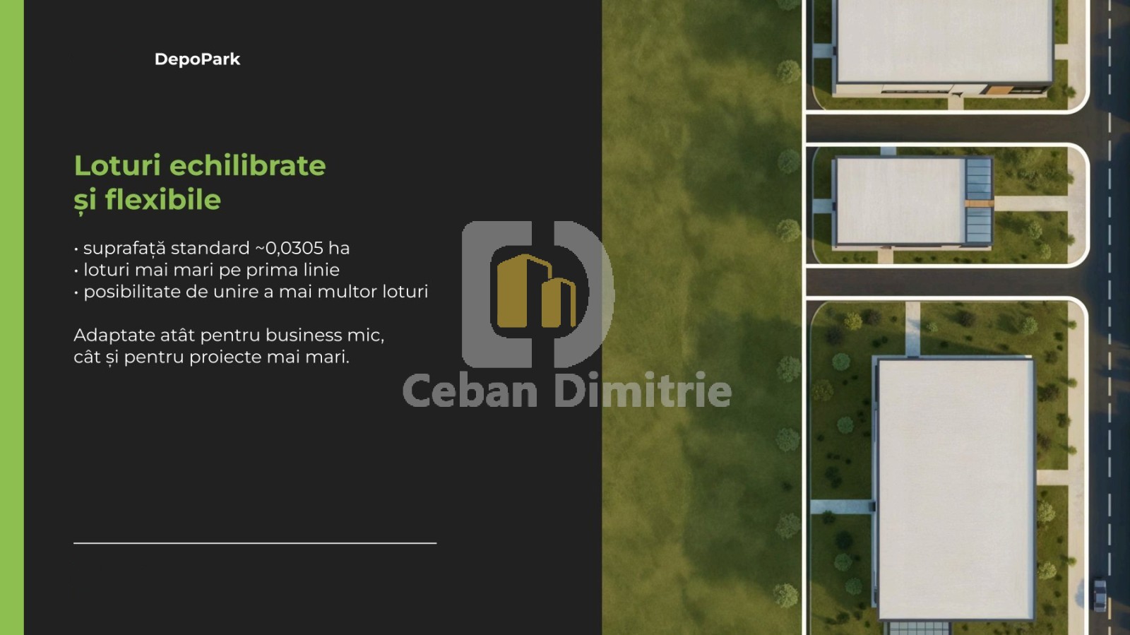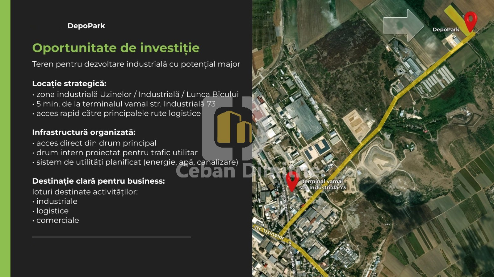 Se oferă spre vânzare loturi de teren destinate dezvoltării industriale și logistice, în cadrul proiectului DepoPark – un parc industrial modern, în curs de dezvoltare, amplasat strategic în zona Uzinelor – Industrială / Lunca Bîcului.