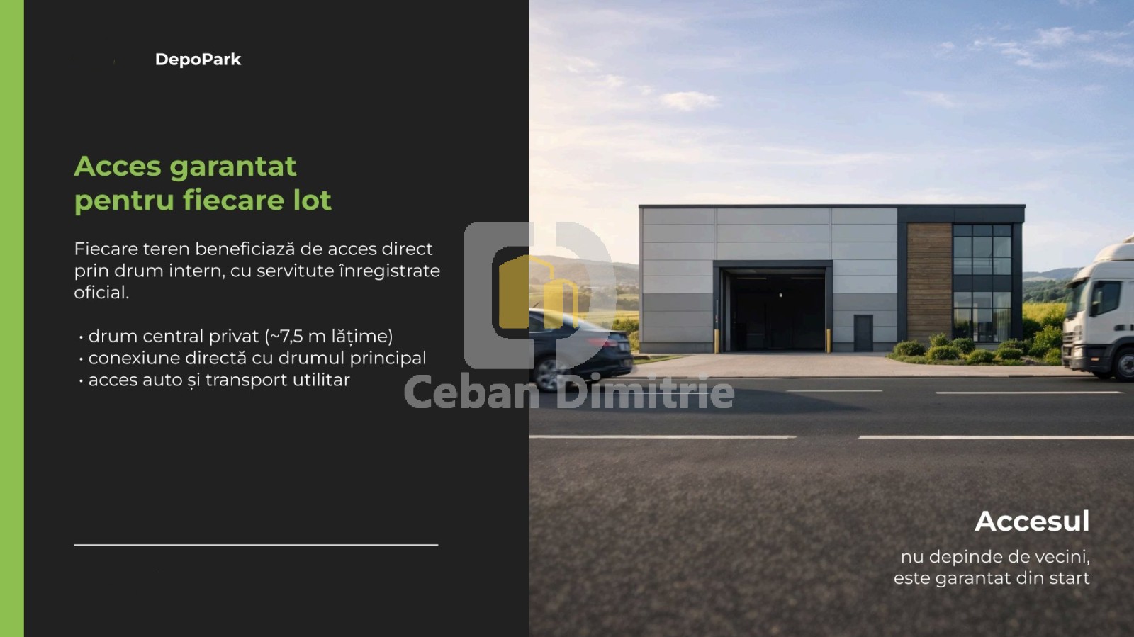 drum intern privat (~7.5 m lățime) cu acces garantat pentru fiecare lot